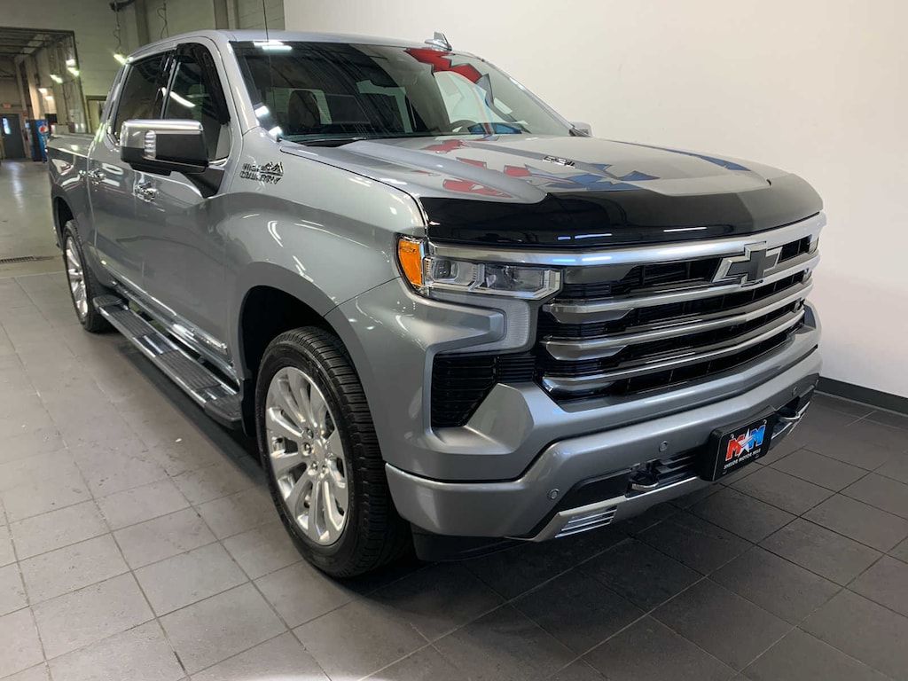 LPO wheels will come with 4 steel 22 wheels from the factory with alignment specs set to 22 LPO wheel selected. Includes wheel locks. (dealer-installed), includes (CF5) power sunroof, (RPT) 22 painted aluminum wheels with Chrome inserts, (XCE) 275/50R22SL all-season, blackwall tires and (RIA) floor liner, LPO, (420 hp [313 kW] @ 5600 rpm, 460 lb-ft of torque [624 Nm] @ 4100 rpm); featuring Dynamic Fuel Management that enables the engine to operate in 17 different patterns between 2 and 8 cylinders, depending on demand, to optimize power delivery and efficiency, a hands-free driver assistance feature for use on compatible roads, includes automatic lane changing and trailering capability, includes (DRZ) Rear Camera Mirror and (UV6) 15 Diagonal Head-Up Display, (dealer-installed), SUSPENSION PACKAGE, ADAPTIVE RIDE CONTROL, with Google built-in compatibility (select service plan required, terms and limitations apply) including navigation capability, 13.4 diagonal HD color touchscreen, includes multi-touch display, AM/FM stereo, Bluetooth® streaming audio for music and most phones; featuring Wireless Apple CarPlay® and Wireless Android Auto® capability for compatible phones, advanced voice recognition, in-vehicle apps, personalized profiles for infotainment and vehicle settings (STD), with Electronic Transmission Range Selector, (ETRS), electronically controlled with overdrive, tow/haul mode and steering column paddle shifters. Includes Cruise Grade Braking and Powertrain Grade Braking (STD). Chevrolet High Country with Sterling Gray Metallic exterior and Jet Black/Nightshift Blue interior features a 8 Cylinder Engine with 420 HP at 5600 RPM*.