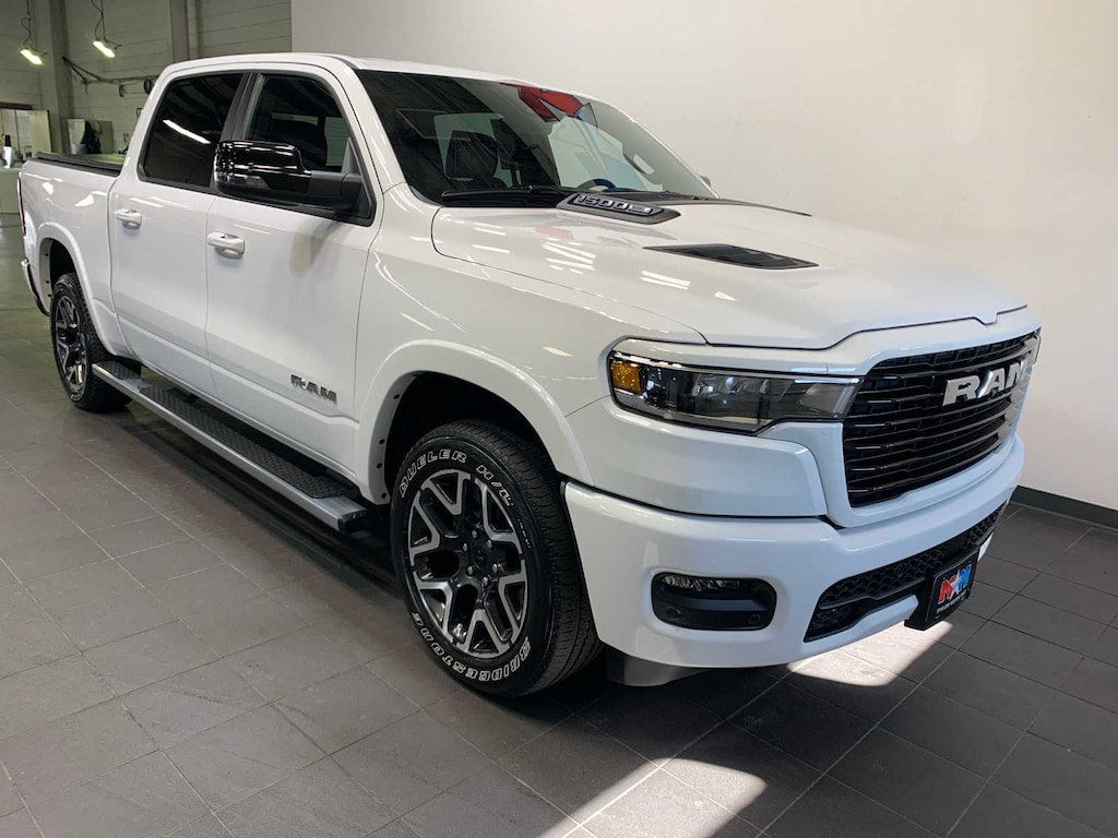Tires: 275/55R20 OWL All Season, Accent Color Premium Power Mirrors, Sport Performance Hood, Black Interior Accents, Body Color Front Bumper, Body Color Rear Bumper w/Step Pads, Bridgestone Brand Tires, Grille Surround 3 Body Color Tex 2 Black, Black Painted Exterior Mirrors Caps, WHEEL TO WHEEL SIDE STEPS, TRI-FOLD TONNEAU COVER, Remote Tailgate Release, Rain Sensitive Windshield Wipers, (STD), (STD), Bucket Seats, Rear 60/40 Folding Split Recline Seat, #1 Seat Foam Cushion, Center Console Parts Module, Heated Second Row Seats, Power Adjust 8-Way Driver Seat, Full Length Upgraded Floor Console. Ram Laramie with Bright White Clearcoat exterior and Black interior features a Straight 6 Cylinder Engine with 420 HP at 5200 RPM*.